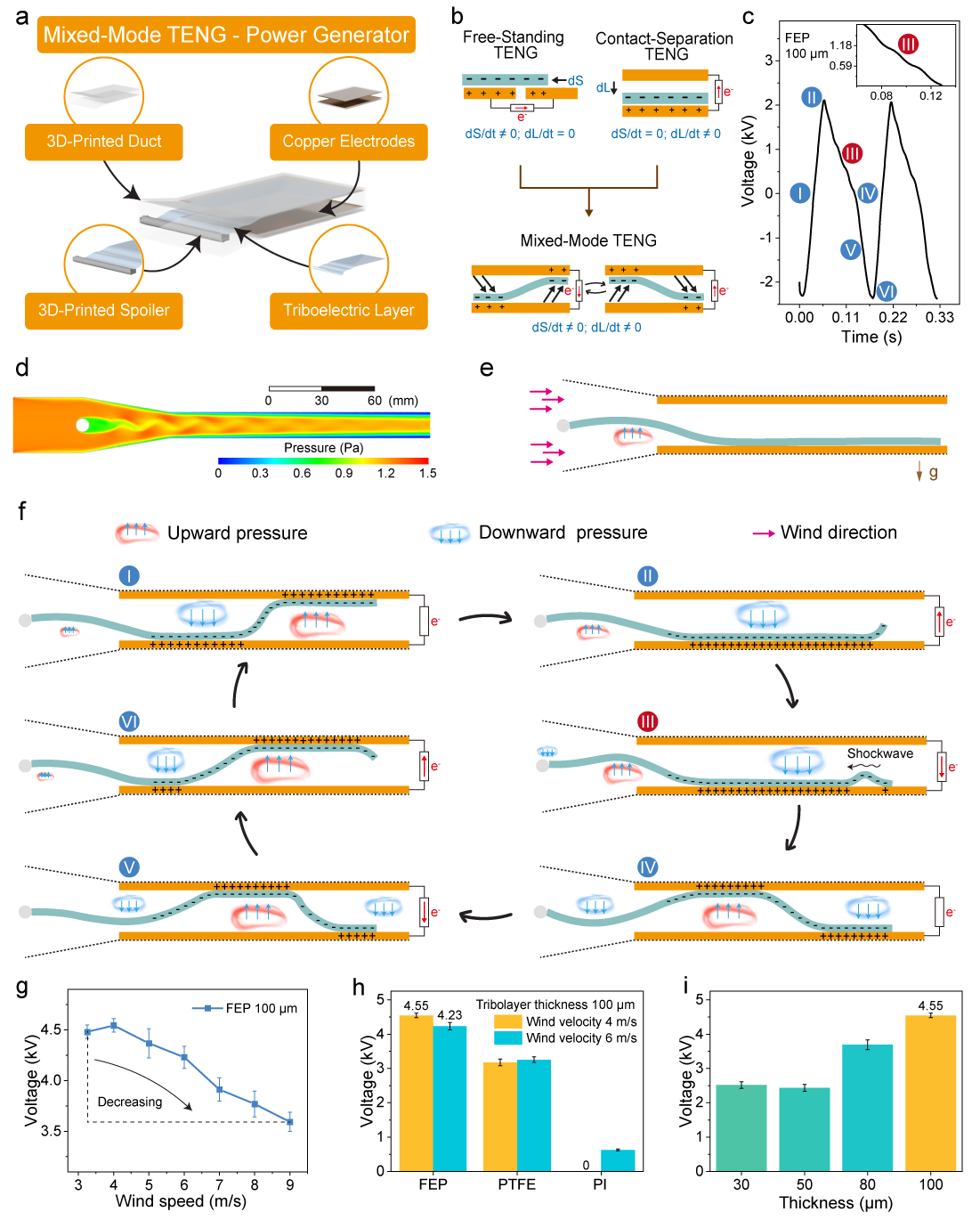 图1.用于风能收集的混合模式TENG的设计、表征和优化。aTESS中用于风能收集的混合模式TENG的结构与组件示意图。b独立层模式、接触-分离模式与混合模式TENG的特性对比。c混合模式TENG输出的电压信号。d在扰流器作用下,涡流引起的压力分布云图。e介电薄膜的初始运动状态。f混合模式TENG的工作原理。g混合模式TENG输出的电压峰-峰值随风速的变化。h不同介电薄膜条件下,混合模式TENG在4 m/s和6 m/s风速条件下输出的电压峰-峰值。i不同厚度的FEP介电薄膜条件下,混合模式TENG输出的电压峰-峰值。