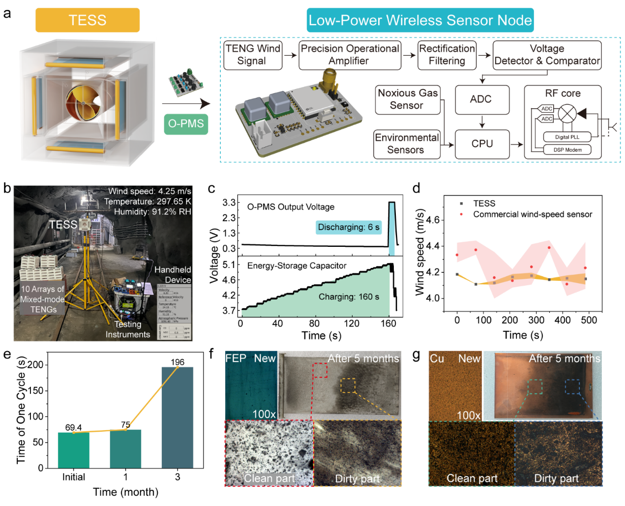 图3.低功耗无线传感器节点的原理、优化以及TESS的现场测试。a低功耗无线传感节点及其各组成部分与功能。bTESS的现场实验照片。c储能电容器的充电与PMS的放电曲线。dTESS与商用风速传感器的风速测量结果对比。eTESS运行三个月的工作周期时长对比。f-g混合模式TENG的FEP摩擦层与Cu电极的表面形貌。