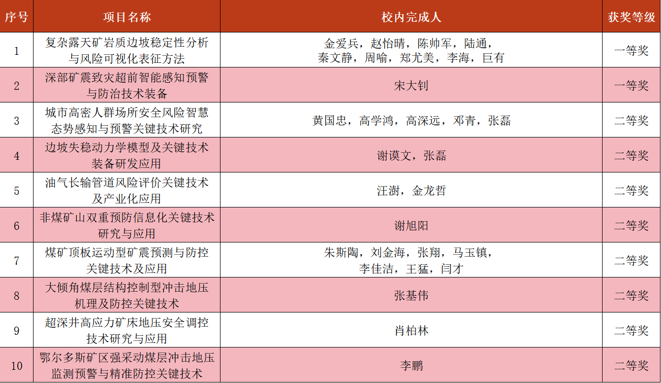 近日,第一届应急管理科技创新奖评选结果正式公布,太阳成tyc7111cc共有11项科研成果获奖,其中资源与安全工程学院10项科研成果获奖,包括一等奖2项,二等奖8项。