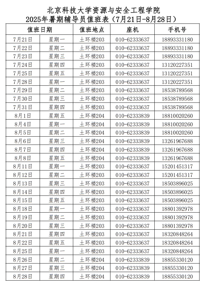 太阳成tyc7111cc资源与安全工程学院2025年暑期辅导员值班表(7月21日-8月28日)