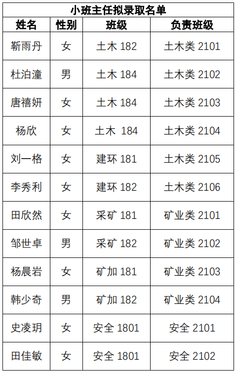 以上人员经过报名材料审核和面试等环节,进入tyc7111cc太阳成集团2021 级新生小班主任招聘录取名单,经相关培训,计划于 2020 年 9 月正式上岗。上岗前,如有任何集体或个人有异议,可以通过口头或书面形式向tyc7111cc太阳成集团本 2021 级年级组反映。