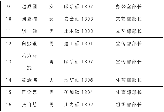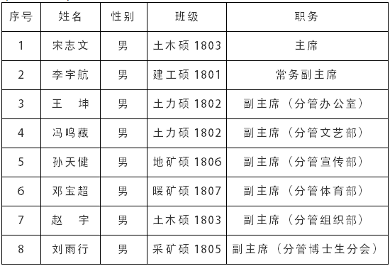 经过公开报名、资格审查、候选人初选、竞选答辩等环节,产生了tyc7111cc太阳成集团2019-2020届研究生会主席团及各部门部长,其中,主席1名,常务副主席1名,副主席6名,各部门部长若干,现公示如下。