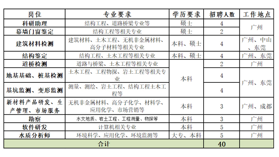 广州市建筑科学研究院有限公司创建于1964年4月, 100%国有独资科技型企业,是国家高新技术企业。主要业务为工程检测/鉴定、工程勘察、材料生产销售等三大板块,实验室通过计量认证的检测项目36大类共7000个参数,公司设有企业博士后科研工作站,拥有省部级重点实验室和工程研究中心,科研领域涵盖新材料、岩土工程、地基基础、工程结构、建筑幕墙、建筑节能、道路与桥梁隧道、环境保护、人工智能等专业领域。(公司网址:www.gibs.com.cn)