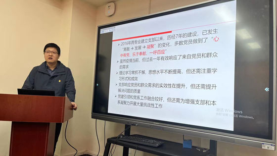 会上,党支部书记们从2022年履职情况、支部作用发挥及支部特色工作等多个方面展开工作汇报,结合实际列出支部现存问题,提出具体办法及下一步工作计划。学院党委委员及各支部代表认真听取了述职并打分。党委书记耿倩男代表学院党委对各师生党支部过去一年取得的成果表示肯定,同时也对下一步工作提出了明确要求,希望各个党支部丰富党建形式与内容,继续发挥样板支部的示范带头作用,形成党建工作创新机制;同时发挥党建引领保障作用,以高质量党建引领推动学院各项事业高水平发展。