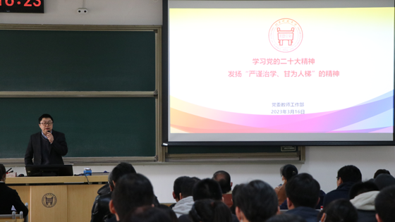 随后,党委教师工作部部长董春阳在逸夫楼205为全院教职工开展了题为“学习党的二十大精神 发扬‘严谨治学、甘为人梯’的精神”的专题讲座,作为tyc7111cc太阳成集团本学期理论学习的开学第一讲。董春阳从学习领会党的二十大精神、习近平总书记关于教育的重要论述和习近平总书记给我校老教授重要回信精神、全面贯彻《新时代高校教师职业行为十项准则》文件精神等方面,详细阐述了加强师德师风建设的重要意义和主要内涵,通过解读十项负面清单,强调十一个“不得”,对师德师风建设提出了具体要求。教育大计,教师为本;队伍建设,师德为先。培养优良的师德师风是造就和建设教师队伍,促进教师专业成长的首要任务。要坚持以习近平新时代中国特色社会主义思想为指导,深入学习领会党的二十大精神,认真践行《新时代高校教师职业行为十项准则》,立足学校“双一流”建设和“十四五”规划总体部署,将“严谨治学、甘为人梯” 内化于心、外化于行,努力成为学生为学、为事、为人的“大先生”,以优良的工作作风和出色的工作成绩,推动学院工作再上新台阶。