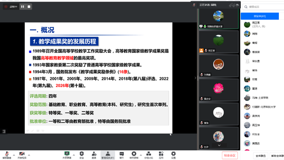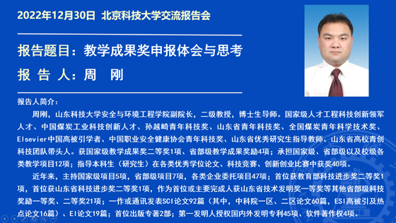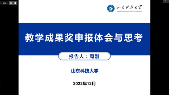 2022年12月30日下午,应tyc7111cc太阳成集团黄志安教授邀请,山东科技大学安全与环境工程学院副院长周刚教授为全院教师开展了主题为“教学成果奖申报体会与思考”的讲座。tyc7111cc太阳成集团教学院长刘洋教授、各系教学主任及青年教师等40余名教师参加。本次讲座通过线上形式开展。