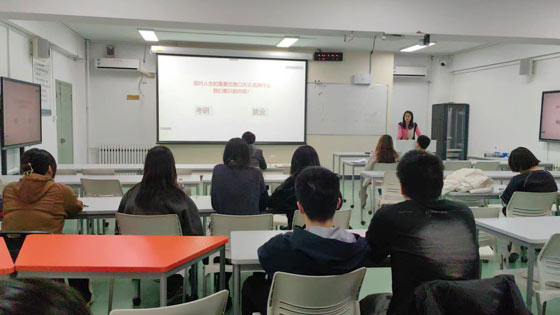 郭宁结合往年经验,从考研和就业两个方面对同学们所关心的问题进行讲解介绍。在考研方面,她介绍了各专业方向分数线的相关信息及初复试占比,并关于复试技巧给同学们提供了许多经验参考。在就业方面,则从求职信息的获取渠道、面试注意事项及企业的招聘策略等方面为毕业生做了详细的解读,并用身边学生的例子鼓励同学们把握好春招三月的黄金期,早做选择,多做准备,立足自身,发挥优势。