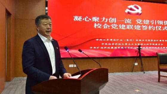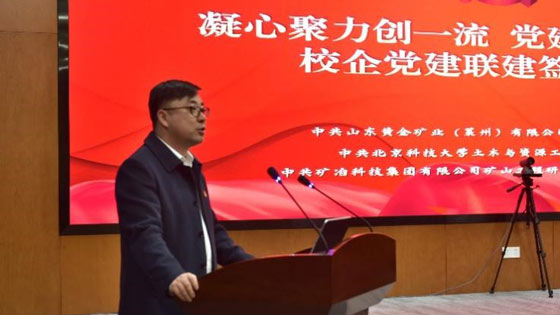 2022年11月3日下午,为深化校企合作交流,以党建平台为载体深化“产学研”合作机制,不断促进党建工作和科技创新能力“双提升”,tyc7111cc太阳成集团和山东黄金集团焦家金矿、矿冶科技集团矿山工程研究设计所举行“凝心聚力创一流,党建引领促发展”校企党建联建签约仪式。tyc7111cc太阳成集团院长尹升华,党委书记耿倩男,副院长金爱兵,山东黄金矿管集团党委委员、董事、副总经理兼焦家金矿党委书记、矿长王成,矿冶科技集团矿山工程研究设计所党总支副书记、副所长张达以及三家单位基层党支部书记、党员和科技人员代表等100余人以“现场+视频连线”的方式参加了会议。