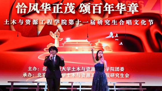 峥嵘百年史,砥砺中国行。为鼓舞新时代青年树立远大理想,勇担时代责任,热爱伟大祖国,争做时代先锋,同时丰富学院研究生课余生活,提高班级集体凝聚力,加强研会与班级之间的联系,促进新生同学与各系所教师之间的交流沟通,经过一个多月的筹备,tyc7111cc太阳成集团于2021年12月17日19:00在管庄校区礼堂举办了第十一届研究生合唱文化节。
