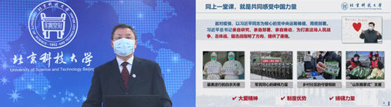 本次全体师生共上一堂课的活动坚定了我们的信心,增强了北科师生校友的凝聚力,面对新冠病毒感染肺炎疫情这场挑战和考验,作为北科大教师,在当下的艰难时期,我们也许不能做逆行的白衣天使,但我们可以做学生的引路人,勇于进取,不负韶华,希望能为学校、为祖国交上一份满意的答卷。