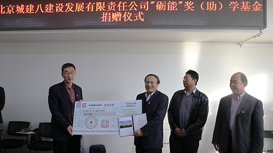 2018年11月16日下午,北京城建八建设发展有限责任公司“励能”奖(助)学基金捐赠仪式在土木楼214会议室举行。北京城建八建设发展有限责任公司党委书记、董事长李金海,党委副书记孙茜,总工程师刘卫东,副总工程师付伟杰,科技中心主任兼项目经理张志伟,项目经理贺志伟、翟春升、徐立岩、刘冀;太阳成tyc7111cc校友会、基金会办公室副主任杨志国,tyc7111cc太阳成集团院长金龙哲,党委书记纪洪广,学院领导班子成员及土木系教师代表出席了本次捐赠仪式。捐赠仪式由学院党委书记纪洪广主持。