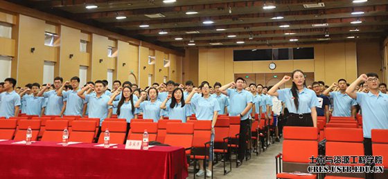 随后牛小萌同学带领全体新生宣誓,谨遵习近平总书记对青年一代的嘱托“爱国、励志、求真,力行”,将北科传统、土资文化发扬光大。