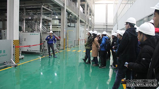 接着,孙博士带领师生们来到104中型示范实验室,展示了机械加工平台、聚合物与碳材料加工实验平台、煤气化冷模实验平台、脱硝催化剂全自动再生装置和水处理实验平台等,并重点介绍了水处理的整个流程和基本装置,包括膜过滤系统、强化自然蒸发装置、石灰软化装置和废水软化技术等。在参观重点实验室的过程中,师生们开阔了眼界,受益匪浅。