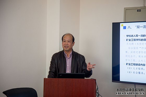 座谈会上,学院党委书记纪洪广首先代表学院向老教授们致以节日的问候,并简要介绍了学院近几年发展情况,还就矿业工程一流学科文化传承建设等方面主动征求、听取老教授们的意见建议。