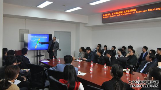 报告会上Hani Mitri教授与现场的老师和同学们积极互动,针对报告中涉及的问题进行了一番探讨,随后的研讨交流会更是气氛热烈。同煤集团刘锦荣所长分享了卸压爆破在同煤集团现场的应用,各位老师也就自己针对这一领域中遇到的问题进行了广泛交流。整场报告拓展了与会师生的国际化视野和思维,在座各位都受益匪浅。