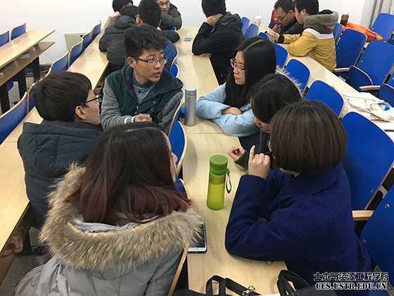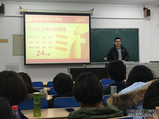 班长湛景震首先介绍了本次班会的背景及意义,随后播放了“社会主义核心价值观”的解读视频,视频过后,大家针对“研究生应如何践行社会主义核心价值观”进行分组讨论并各派代表进行交流分享。