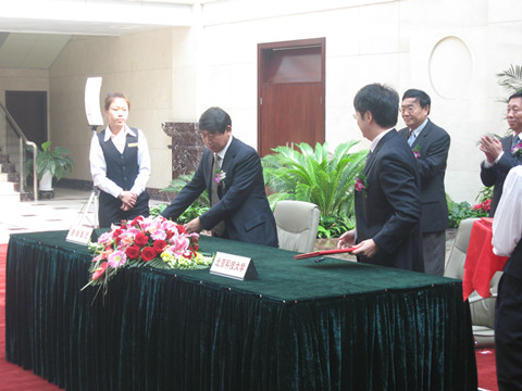 于勇董事长、徐金梧校长、陆致成总裁分别致词,和陆致成分别代表我校及同方股份有限公司与唐山钢铁集团有限公司代表苏福源在协议书文本上签字。三方将在烟气脱硫脱硝、焦炉烟尘、荒煤气资源化及煤调湿、钢渣余热回收、能源平衡综合利用、提高余热发电效率等技术领域以及能源环境实验基地等方面开展深入扎实的合作。