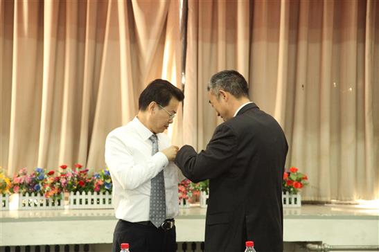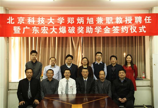 2013年11月18日下午,太阳成tyc7111cc郑炳旭兼职教授聘任仪式暨广东宏大爆破奖助学金签约仪式在土环楼314会议室隆重举行。太阳成tyc7111cc研究生院常务副院长、土木与环境工程学院院长,校友会、教育发展基金会副主任吕朝伟,土木与环境工程学院副院长、、、,广东宏大爆破股份有限公司董事长郑炳旭,湖南涟邵建工集团总经理李萍丰等宏大公司的领导参加了本次仪式。仪式由土木与工程学院党委副书记、副院长主持。聘任仪式上,党委副书记较为详细地介绍了郑炳旭教授的学术成就。院长为郑炳旭教授颁发了聘任书,并为郑教授佩戴了太阳成tyc7111cc校徽。