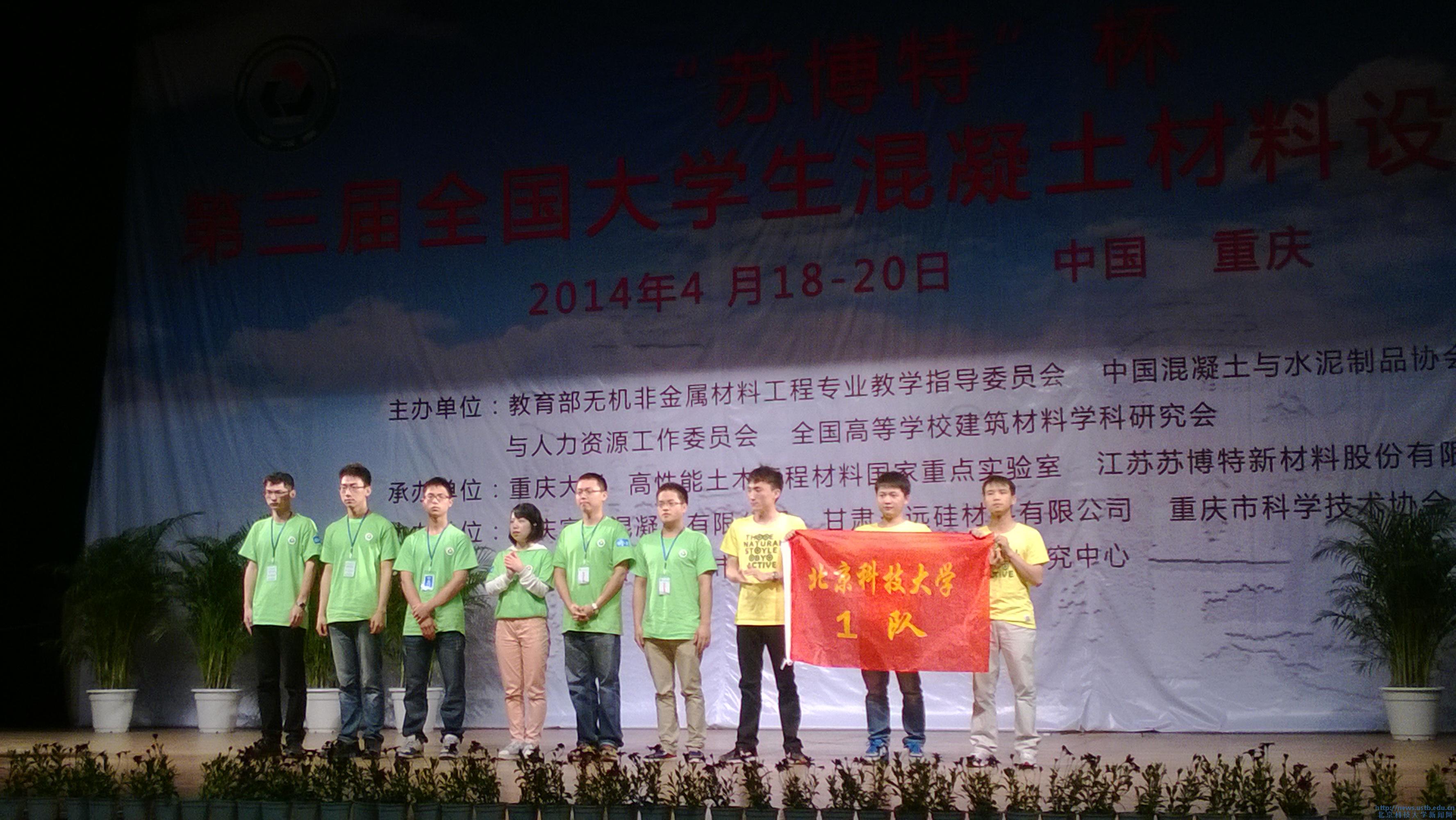“苏博特”杯第三届全国大学生混凝土材料设计大赛4月20日在重庆大学落下帷幕。来自同济大学、东南大学、太阳成tyc7111cc、重庆大学、中南大学、哈尔滨工业大学等61所高校的材料、土木和交通领域109支队伍参加比赛。我校土木工程专业2011级学生苏晓波、陈龙根、章同学组成的参赛队夺得特等奖;胡超、丁明涛、陈炫同学组成的参赛队也以优异成绩获得二等奖。教授获得大赛优秀指导教师。