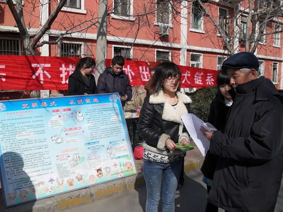 活动开始后,同学们积极参与活动,主动搬运所需宣传物品。横幅刚刚挂好,就有居民上前询问,于是我们开始耐心向他们讲解有关垃圾分类的重要性,告诉社区居民怎样做到垃圾分类,为什么要垃圾分类,居民们对这些信息很感兴趣,纷纷向我们要了宣传册,这让我们也感到十分欣慰,看来我们的宣传还是有一定效果的。但是到宣传“文明养犬”时,却遇到了一些困难,在与社区居民交谈过程中,我发现很到居民对于社区养犬不文明现象十分反感,有一位老人拉着我的手说:“这样的活动太需要了,现在小区养狗太多了,狗到处拉屎去没有人清理,出门遛狗也不拴,太危险了!”听完老人的一席话,我突然觉得社区养犬不文明问题的确很严重了,于是我们向周围养犬的居民发放“致居民的一封信”内容是有关所有文明养犬的细则,大多数养犬人还是能心平气和的接受我们的建议,并说明以后会按照文明养犬的方法来执行,但也有个别居民,对我们的活动不屑一顾,认为他们养犬的方式没有错误。面对这样的居民,我们就耐心的“动之以情,晓之以理”,最后他们也终于理解了我们的活动,并答应会做出改正。