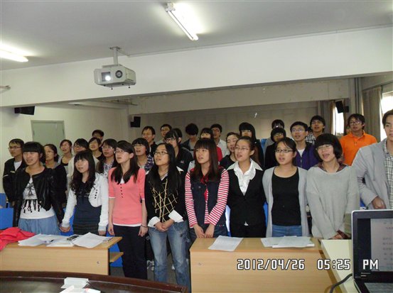 2012年4月26日下午5点,由环境1001及1002团支部组织的校歌传唱活动在土环楼402成功举办。在北科大六十周年校庆尚未褪尽的余热里,同学们积极学唱校歌,表达着自己对母校由衷的喜爱与赞美之情。
