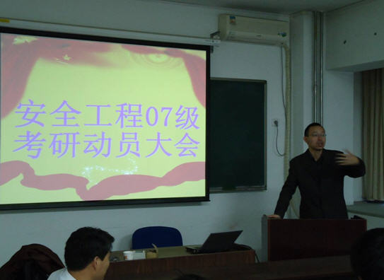 适逢2011年考研正式报名之际,为了帮助同学们正确地报考适合自己的专业,鼓励报考的同学以饱满的精神状态参加考试复习中去,10月15日上午,在土木与环境工程学院1018教室召开了安全工程07级考研动员会。主任教授,书记老师以安全工程071,072班的班主任老师、刘建老师出席了动员会。