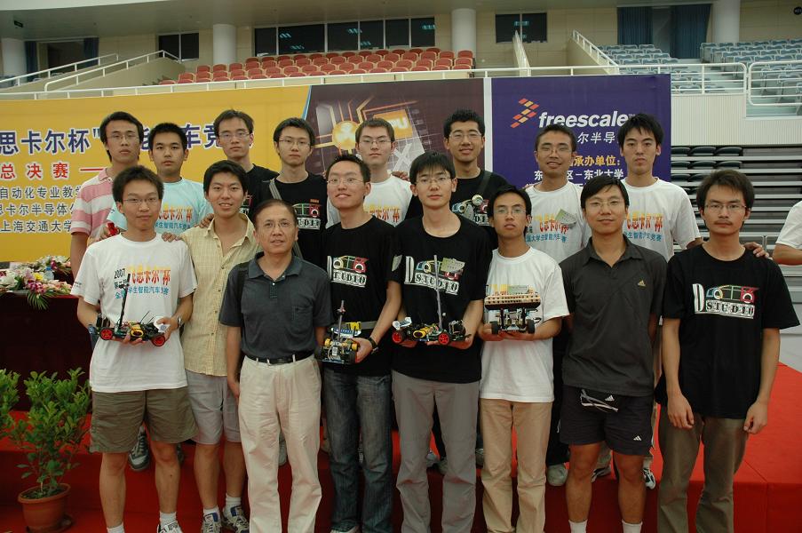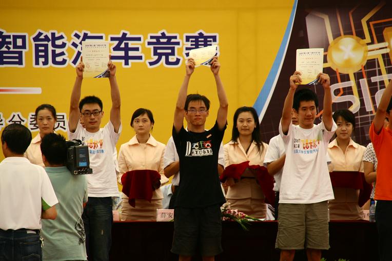 第一届全国大学生智能汽车竞赛总决赛于去年8月在清华大学举行,在来自全国的112支队伍中,我校以第八名的成绩获得二等奖。一年中,队员们刻苦钻研,团结协作,自主攻克了CCD摄像头图像数据分析、高速摄像头图像采集系统、基于灰度图像的黑线提取算法、直流电机H桥驱动电路等核心技术,在众多参赛队伍中处于领先地位,受到了大赛组委会及各参赛队的广泛关注与肯定。据悉,下届总决赛将移师东北大学,规则会更加复杂,竞争也将更加激烈,希望我校参赛队再接再厉,取得更好的成绩。