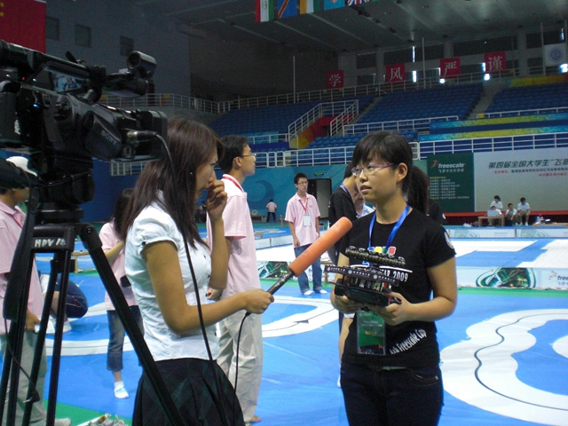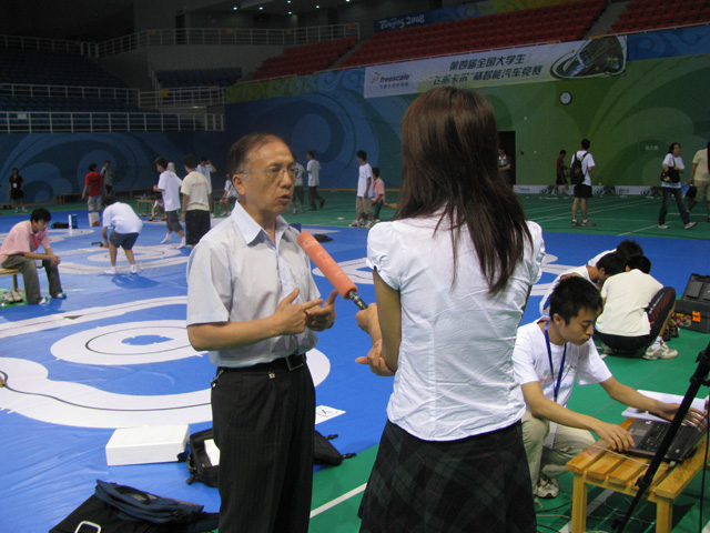本组试车结束后,中国教育电视台的两名工作人员采访了太阳成tyc7111cc智能车队光电组的两位队员强艳和周向明,强艳主要介绍了太阳成tyc7111cc智能车的基本构造,摄像头组智能车与光电组智能车的区别以及智能车是如何识别赛道的,周向明则着重向中国教育电视台的两名工作人员表达了他试车前后的心情,“这次是赛车的第一次亮相,试车前心里有些紧张,真正站在了赛道上,心里却平复了许多,赛车是全队所有队员几个月来充分准备,辛苦努力的结果,我们有自信试车的成功!”提及明后两天的预赛和决赛,强艳和周向明均表示,“所有赛车都是在学校老师的关心和指导下,智能车全体队员几个月一路欢笑,一路汗水,一路收获的心血,我们都相信明后天的赛场上赛车能够取得好成绩!”随后,中国教育电视台的工作人员又采访了天津城市建设学院和北京航空航天大学智能车队的队员,北京航空航天大学智能车队的队员自信满满地说,“我们的车根据已经结束的华东赛区的赛道,跑出了9秒4,9秒5的好成绩,期待在赛场上和太阳成tyc7111cc的智能车一绝高低!”