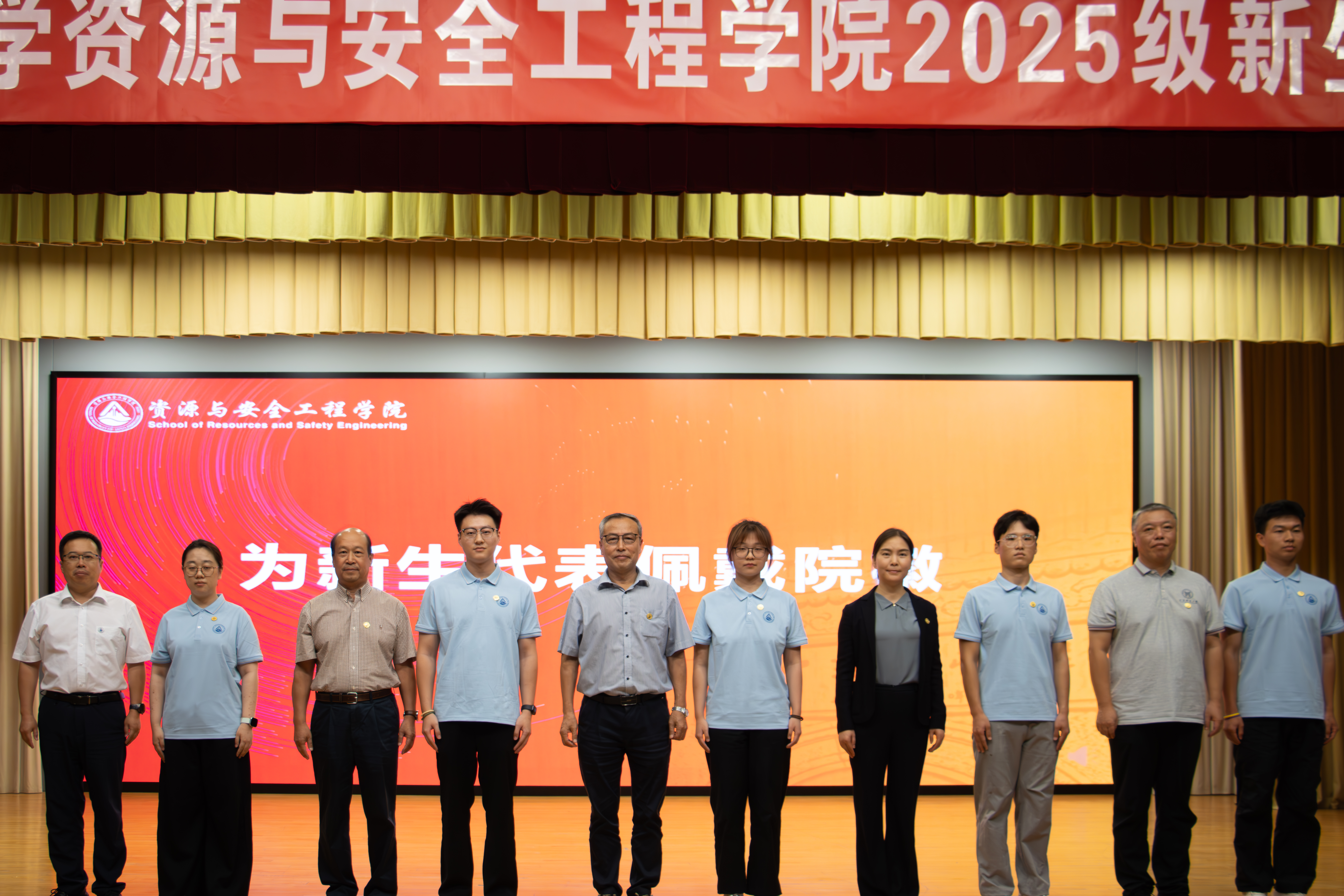 在庄严的国歌声中,典礼正式开始。何学秋、纪洪广、耿倩男、苗胜军、黄国忠为新生代表佩戴院徽,标志着他们正式加入资源与安全工程学院大家庭。