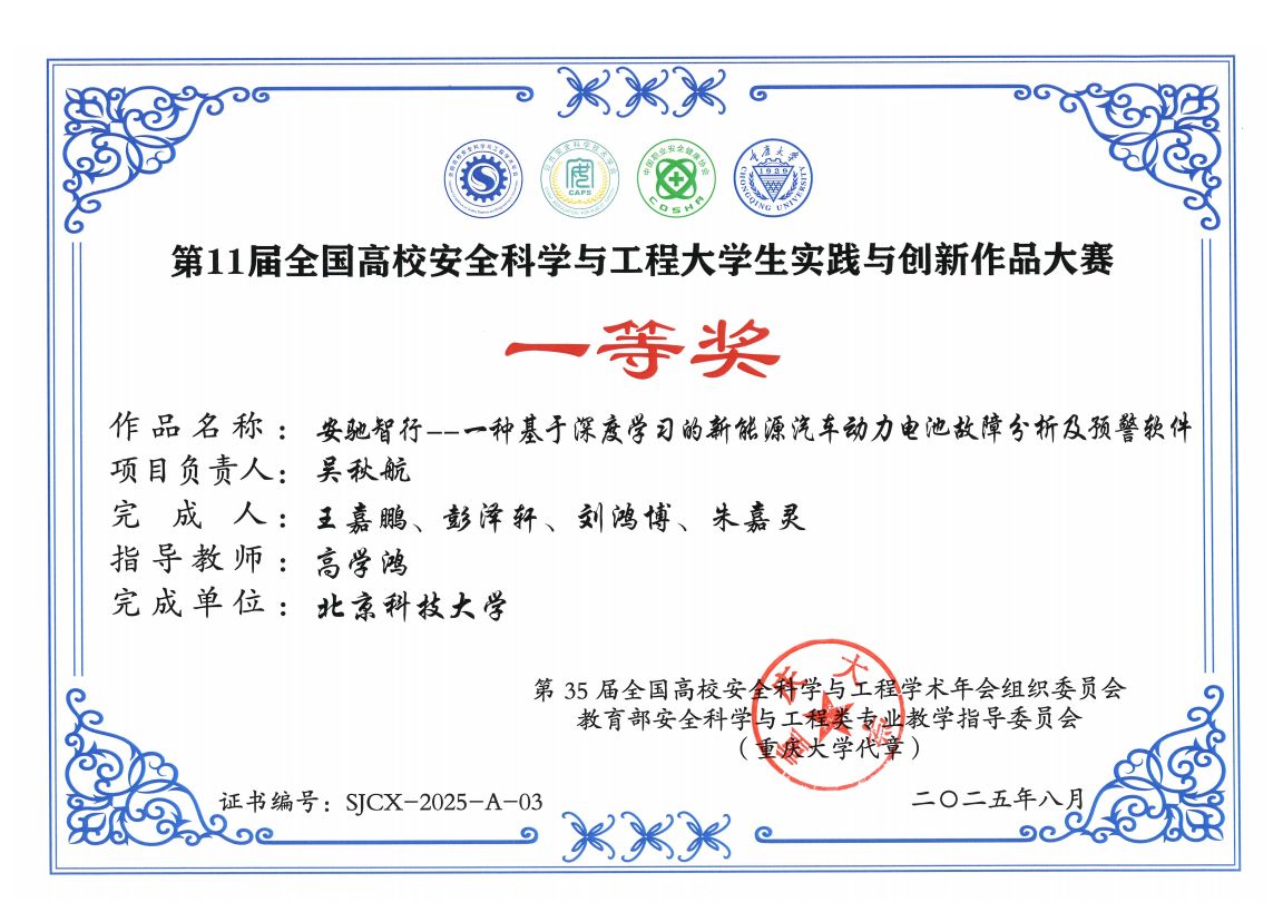 所获奖项:第11届全国高校安全科学与工程大学生实践与创新作品大赛国家级一等奖