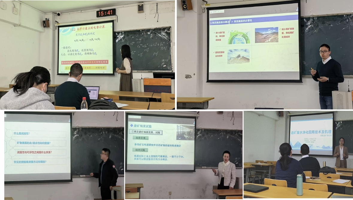 比赛中,参赛教师紧密结合课程特点与工程实践,带来了一堂堂思路清晰、设计精巧的专业课,赢得评委与观众的阵阵掌声:王雪主讲《氧化还原滴定曲线》,逻辑严密,层层递进;常自勇带来《破碎流程的选择——预选抛废》,将工程案例与理论分析有机融合;李东讲解《矿物表面的润湿性与可浮性》,深入浅出,生动形象;张娜展示《浮选试验——磨矿细度》,实验环节设计细致,操作规范;杨雪彤讲授《选矿废水净化回用技术及机理》,紧扣环保前沿,思政元素融入自然。五位青年教师同台切磋、各展所长,以扎实的专业素养和富有活力的教学风采,诠释了新时代青年教师的责任与追求,体现了矿物加工工程系的学科特色。